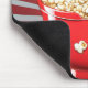Popcorn exploding out of a red bowl with red and white starburst striped background