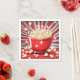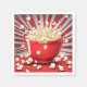 Popcorn exploding out of a red bowl with red and white starburst striped background