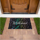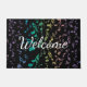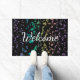 Exploding Rainbow Notes Music Doormat Welcome Mat. Blue green purple gold pink and lavender musical notes explode outwards from the center on a black mat with customizable Welcome text. Perfect for outside your studio or home and a great gift for your favorite musician or music lover. The text can stay as is or change it to whatever you prefer.