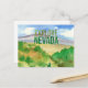 An Explore Nevada themed postcard decorated with a desert landscape and tree covered hills with soft purple mountains in the distance hand painted with watercolor and accented with spatter spots. Great fun way to say hello or use for postcard exchanges!