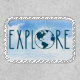 Explore the World patch. Navy blue lettering and globe on blue sky background.