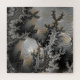 A spherical object with a reflective surface sits prominently among complex, fractal-like patterns with various shades of gray, black, and gold. The intricate patterns appear almost like a textured landscape, while the sphere acts like a lens distorting and compressing the surrounding details.