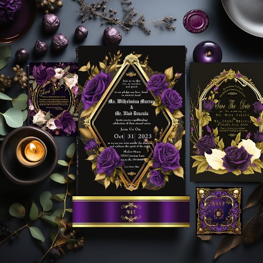 Welcome to our Elegant Vintage Gothic Wedding Invitation Suite! This exquisite invitation features a perfect blend of dark and bright purple florals, complemented by elegant gold and wood accents. Not only ideal for weddings, this versatile invitation can also be customized to suit other special occasions like anniversaries, birthdays, or engagement parties.