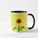 A single bright yellow sunflower with green stalk and leaves stands against green doodle strokes on a colorful coffee mug. Part of our eye catching Bright Yellow Sunflower Collection.