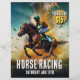 The central image showcases a captivating scene of racehorses in action, expertly capturing the spirit and energy of a horse racing event. The horses' powerful forms and the jockeys' focused expressions immediately draw the eye, setting an exciting tone for the flyer.