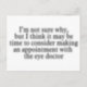 A humorous, simple card to use to remind your patients that it's time to schedule an appointment for their annual eye exam. Features blurry text, designed to make the point that it becomes difficult to see when one's glasses prescription is not up to date. All text on the back of the card is customizable.
