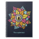 Spooky reptile eye notebook with a digital art of a weird eyeball with reptile iris and pupil surrounded with colourful petals and customisable text. This crazy surreal illustration has fun yellow, orange, coral, pink and light blue colors with decorative elements over customisable dark blue background and, being strange and dark, is great for Halloween.