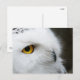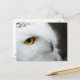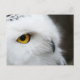A photograph of the profile view of a beautiful white snowy owl with gold eyes.