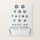 Eye examination chart with all the letters blurred apart from the words eye and test viewed through the glasses