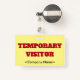 This bold badge design features the message "TEMPORARY VISITOR", and a customizable company name or other custom message. A badge like this could be used to identify that somebody at a workplace or business is an authorized guest/visitor. [~Z0000307]