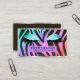 Trendy, bright zebra pattern, glam business cards for estheticians, eyelash and makeup artists, stylists, hair stylists, beauticians, cosmetologists, nail salons, beauty bloggers, and other beauty-related businesses and professions- Front has bright pastel, zebra pattern animal print background in shades of purple, aqua, turquoise, pink, and orange with black zebra stripes. Personalized name and professional title on front in modern, black lettering on translucent, matching purple and pink frame. Above are turquoise glam glitter, makeup eyeshadow eyes with eyelash extensions. Simple, faux metallic silver frame border. Matching solid background on back with personalized contact details, including social media, in coordinating teal lettering. Note: All images are printed. Not actual glitter or metal. We have more eyelash business cards for makeup artists and salon professionals, plus this matching eye makeup design on other girly products in our Zazzle.com/angela65* shop.