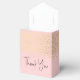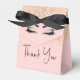 Closed eyelashes with eyeliner, glitter eyeshadow, and gold glitter dots on a blush pink background for thank you.