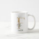 Letter F monogram floral. Letter F in golden brown texture accented with green watercolor compound leaves, flower blossoms and gold dust. Personalized with name in matching font.