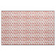 Cute red puppy with blue and white collar is tiled across fabric. Photo image of toy dog crocheted in yarn.