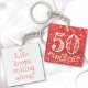 This double-sided key chain design features a "50 and fabulous" birthday celebration over a coral glitter bokeh background. The number 50 dominates the top of the design while fabulous, is in all caps and curved along the bottom. The back has template text "Life keeps rolling along!!". Personalize the text, remove the text or click customize to select a typeface style, size, and color you prefer.