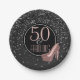 For the 50 year old fashionista's birthday party paper plates- Woman's silver and black with a touch of rose gold pink- Fabulous fiftieth birthday party paper plates Read 50 & Fabulous in rose gold pink with a silver gray color ampersand on a black circle. A pair of pretty faux rose gold glitter shoes with stiletto high heels sit in the lower right corner. With a scattered faux silver foil confetti dots pattern on a matte charcoal black background. Elegant black and silver 50th birthday party supplies for 50 year old divas. More Fabulous 50th birthday party plates and party decor are in our Zazzle.com/angela65 store.