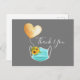 A simple heartfelt "thank you" for those that have done so much. Design features blue face mask with watercolor heart balloon, white script text and sunflowers bouquet on gray background.