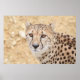 Witness the captivating gaze of a cheetah up close, its face framed against a backdrop of sandy desert hues. A moment of beauty in the heart of the wilderness