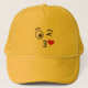 A kissing emoticon. One eye is open, the other is winking. A heart is shown leaving the kissing mouth.