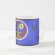This clipart is a cartoon of a scarecrow made of hay and straw. The scarecrow is dressed in a long sleeved shirt with patches. A straw hat is placed on the faceless scarecrow. The scarecrow is standing on a stick under a full moon with bats flying all around. A colorful backing of yellow, blue and red was used to accent the scarecrow. These are available in assorted backround colors. these mugs come in an assortment of styles, colors and sizes.