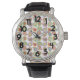 This men's watch has a mid-century modern design of faded paisleys layered on top of each other in retro colors with one layer having an atomic pattern.