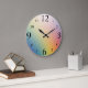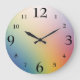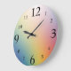 This stylish and colorful wall clock features a rainbow gradient design. The colors appears in the same pattern as a typical rainbow with blue or indigo, green, yellow, orange, red, and purple. The colors appear more dense near the bottom and gradually fade toward the top, similar to a real rainbow that is faded in the sky. The numbers are printed in a bold black font with the 12, 3, 6, and 9 printed slightly larger.