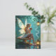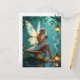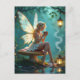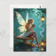 A sweet postcard to keep in touch with freinds and family members featuring a fairy sitting on a msurhoom in an enchanted forest being lit up by lanterns drinking a warm cup of coffee.