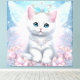 An adorable fairy princess white kitten with jewels, pink flowers and fairy wings on a sparkly blue background.