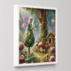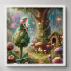 This wall art has an ai watercolor illustration of a fairy sitting on an artichoke, next to a big tree, whimsical village, flowers and butterflies.