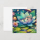 Cute little fairy sleeping on a lotus flower on a lily pad with flowers and mushroom background. Cute fairytale style illustration. Blank card.