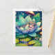 Cute little fairy sleeping on a lotus flower on a lily pad with flowers and mushroom background. Cute fairytale style illustration.