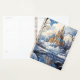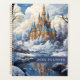 This planner features a winter illustration of a fairy tale castle with elegant blue turrets inspired by German and French design. The castle is surrounded by snow-capped trees and a small creek flows in front of it. The design is the same on the front and back covers. Personalize the front with the current year.