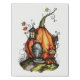 The image depicts a whimsical, fairy-tale-style house shaped like a large, vibrant orange pumpkin. The pumpkin has been transformed into a cozy dwelling with a wooden door at the front, two small windows on the sides, and two quaint, turret-like structures on the top with red roofs. The house is surrounded by twisting vines and autumn leaves, adding to the magical and enchanted atmosphere. The setting suggests a serene, woodland environment, perfect for a storybook fairy or magical creature.