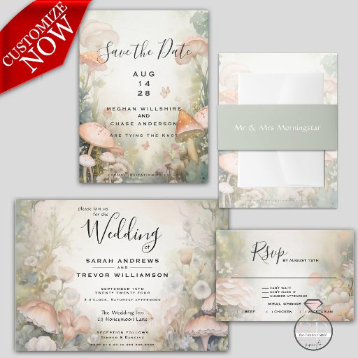 Step into an enchanted magical realm with our ethereal wedding tapestry backdrop, perfect for photoshoots, welcome banner or at the alter. Bathed in soft, muted green lighting, adorned with magical blush pink mushrooms amidst woodland images, our invitations whisper of fairycore charm, inviting guests to an enchanting cottagecore affair. Easy to personalize template .. Original Design © WhimsicalArtwork™ Part of a complete wedding stationery suite.
