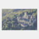 Romantic, fairytale castle surrounded by a dense green forest photographed from above.