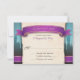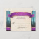 Fairytale wedding RSVP reply cards designed with a purple and gold banner and the words "The favor of a reply...", castles in the distance over a blue to brown gradient, and your wedding RSVP details over a tattered old beige vintage paper texture illustration.