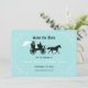 Fairytale wedding save the date cards with a bride and groom riding in a horse drawn carriage. Ornate frame on a robin's egg blue background. Perfect for your storybook princess wedding! Also available in other colors. Please contact pmcustomweddings@hotmail.com for custom colors. Matches our horse and carriage fairytale wedding set.