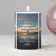 This pillar candle has a design that features the serenity prayer with a Umbra Lt print font with black letters light blue outline over a background picture showcasing a lakeside view of a beautiful lake with a reflecting view under an abstract colored sky in this faith based theme. The candle is covered with a beautiful full-color wrap hand poured, individually designed made with high grade American paraffin & beeswax and, burns approximately 40 hours made in the USA.