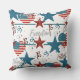 Pillow features patriotic stars, hearts and confetti in the colors of the USA American flag with a vintage retro feel. The words Freedom, Faith and Liberty are scattered randomly in the design.