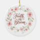 Delicate watercolor pink blossoms frame "Faith in Bloom" in elegant script on this charming round ornament, perfect for adding a touch of inspiration to your holiday tree.