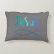A basic pillow of faith in greens and blues it says simply "Jesus" with the christian symbol of the fish. I love the simplistic design and each side is a different shade of background grays. Share this with family and friends of faith a good gift for all.