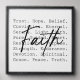 Set against a white background, this wall tile features the word “faith” in a soft, flowing script that stretches confidently across the center. Behind it, filling the space beneath the main word, are all-lowercase typewriter-style words—each one a reflection of faith’s many facets. Words like trust, hope, peace, truth, and belief stand out in uniform rows, creating a textured backdrop of conviction and clarity. The layered typography creates both contrast and cohesion. It's a visual meditation on what faith is made of—simple, striking, and quietly powerful.