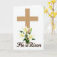 This card features a natural-looking wooden cross with softly detailed grain at the center, set against a bright white background. At the base, a cluster of white lilies leans in close, their open petals and gentle curves suggesting a tender closeness, like friends gathered side by side. Yellow-orange stamens add small sparks of color inside each bloom, while deep green leaves frame the flowers with a calm, grounded feel. A single green bud sits tucked among the open lilies, hinting at something just beginning to unfold. Below the artwork, a flowing line of text is placed near the bottom in a dark, ink-like tone that stands out clearly on the white space. A small touch of 🌷 adds a soft seasonal note without crowding the layout. The cross rises straight above the flowers, with the lilies arranged in a neat arc across the lower center.