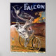 A vintage poster by Jean de Paleologue for Franco American Bicycle Co. circa 1893. A woman dressed in a gossamer outfit riding a bicycle. A white falcon sits on her hand.