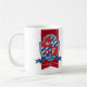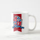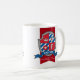 Falcon name meaning shield red blue boys mug. Galiant royal crown knights style crest shield monogram letter F art name mug perfect for kids and teens in shades of red, blue, white and gray. Personalize with your own name beginning with F and name meaning or a message or subject for a personalized touch. Reads Falcon An athletic bird. Blessed with speed and courage. Other names available on mugs and other matching products. Unique royal style crest drawing, featuring a birds head, crown, star and initial monogram F letter, graphic art and design by Sarah Trett www.sarahtrett.com for www.mylittleeden.com