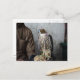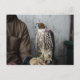 Postcard of a blindfolded falcon used for falconry on the handshoe of a falconer in Doha, the capital of the Gulf country Qatar.