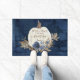 "Fall Autumn Pumpkin Navy Welcome Mat Family Name." Perfect as a hostess gift for a family that is sharing their home with you for the weekend or as a welcome mat for your invited guests! Personalized with your family's name and message this navy blue rustic wooden background with a white pumpkin and muted fall foliage in earth tones with dusty and navy blue flowers all painted in watercolor by Internationally licensed artist and designer, Audrey Jeanne Roberts, copyright all rights reserved.
