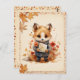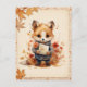 Fall / Autumn vibes postcard featuring a watercolor fox holding a letter surrounded by fallen leaves.