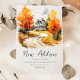 Introducing an exquisitely designed fall moving announcement card that beautifully captures the essence of joy and new beginnings. This charming card features a breathtaking watercolor illustration of a rustic house, perfectly nestled among a tapestry of vibrant autumn trees adorned with rich, fiery orange leaves.