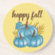 Classic fall blue pumpkins coasters! Trendy typography quote says "happy fall". Three cute and colorful blue pumpkins with autumn leaves. Fall gold background. Ready for your favorite drinks!